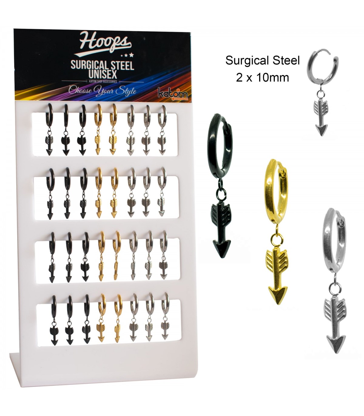 Plain steel hoops display with cross pendant.2 sizes: 16mm x 10mm and 25mm x 16mm.four colors: black, golden, steel and rainbow.(Number of pieces: 32)