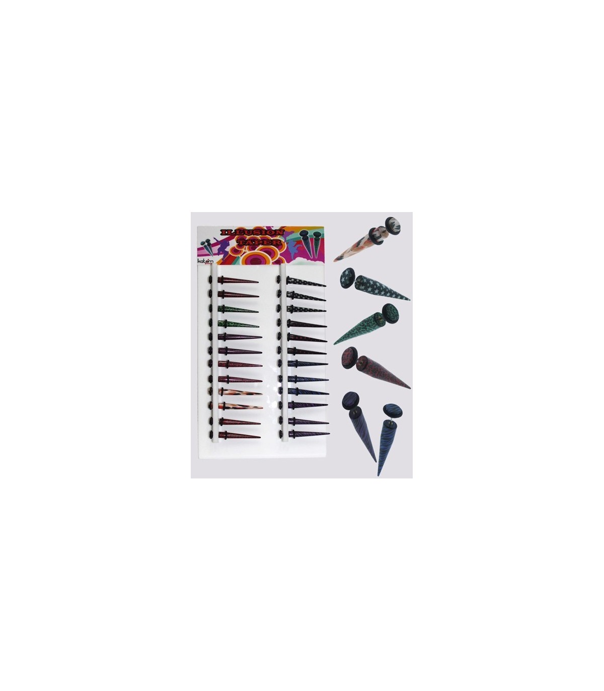 Exhibitor of 32 pieces of illusion plug of steel with a shiny point on one side and plain on the other side . Measures 4mm, 5mm, 6mm, 8mm.para man and woman.