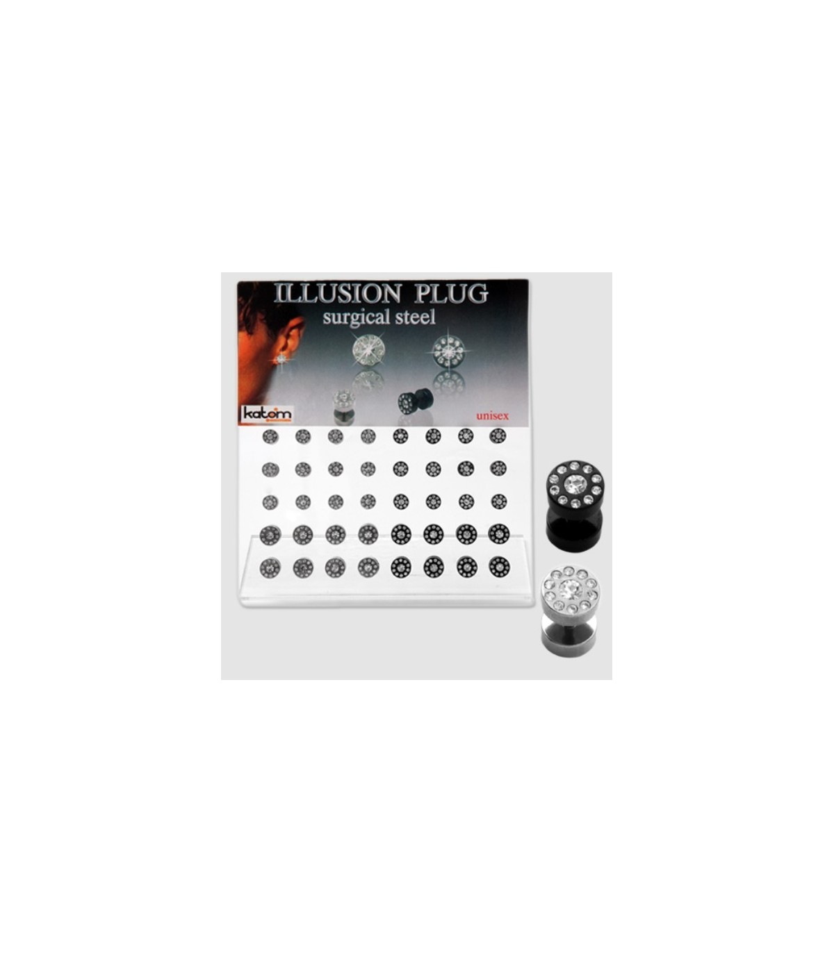 Exhibitor ilusion plug of 36 units sizes 8, 10mm 2 colors black and steel. With crystals swarovski type.