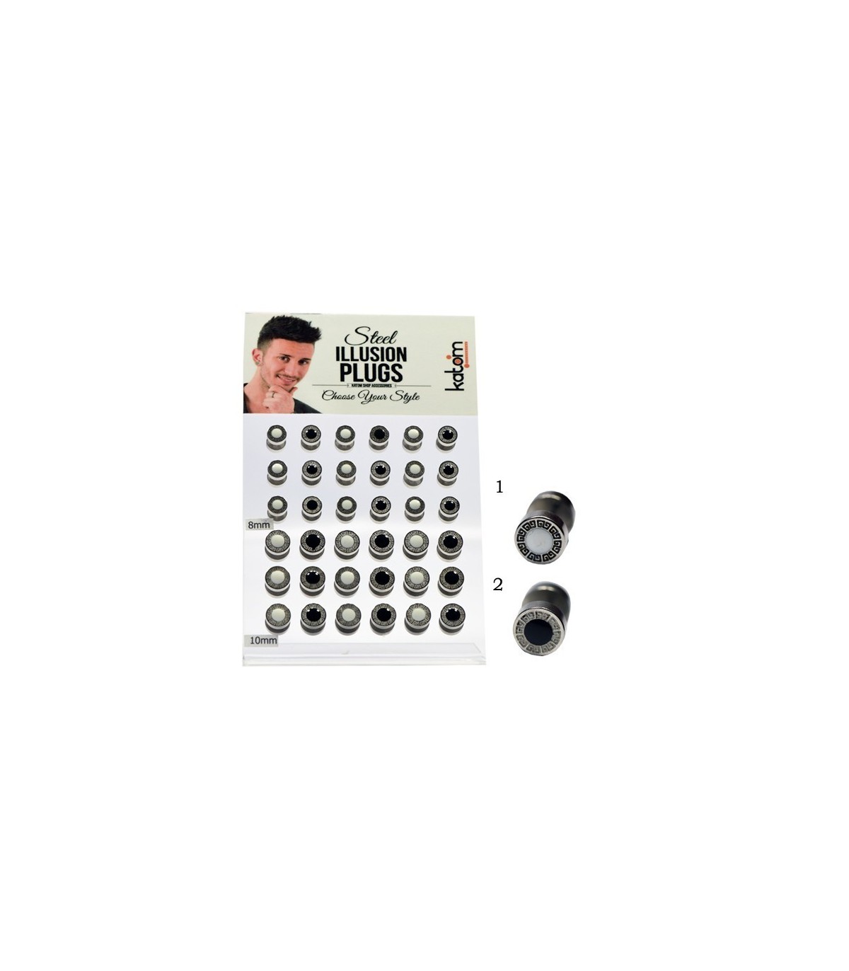Exhibitor ilusion plug of 36 units sizes 8, 10mm 2 colors black and steel. With crystals swarovski type.