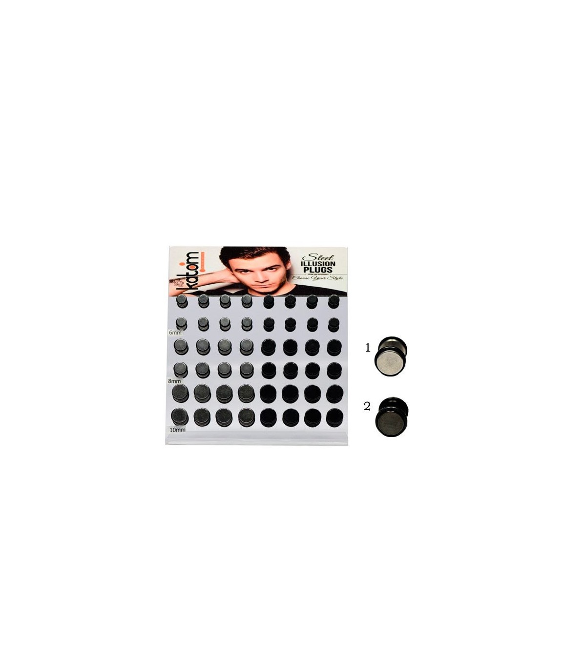 Exhibitor illusion plugs of steel. Size: 8mm. Stones in black and white.