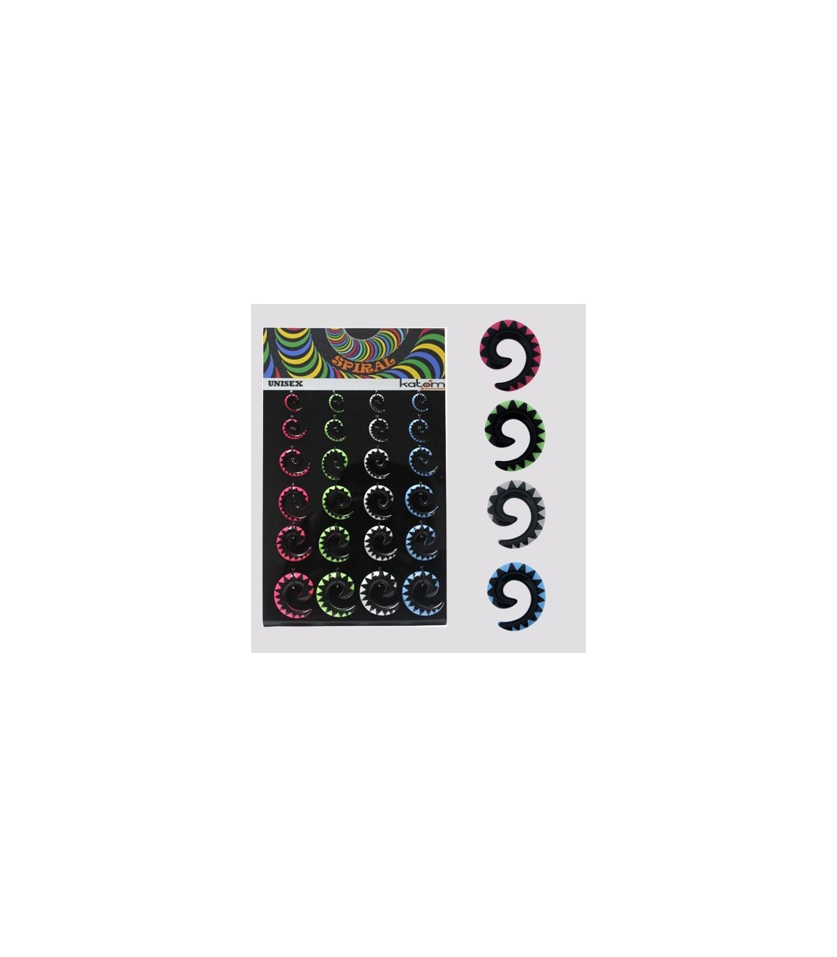 Exhibitor expanders forms spiral of sizes 3mm, 4mm, 5mm, 6mm, 8mm and 10 mm. in green, yellow, Fuchsia, lavender and light blue. (Number of pieces: 60)