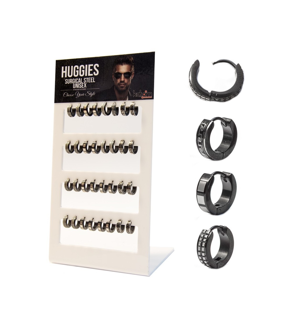 Exhibitor steel Hoops for boy and girl. Two Colors: steel and black with swarovski stones. (Number of pieces: 32)