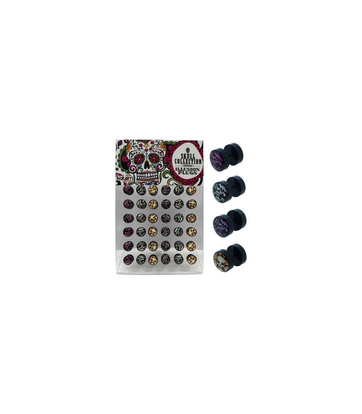 Display of 36 units of illusion plugs of 8 mm. 6 models with different colors. Take gums on 2 sides.
