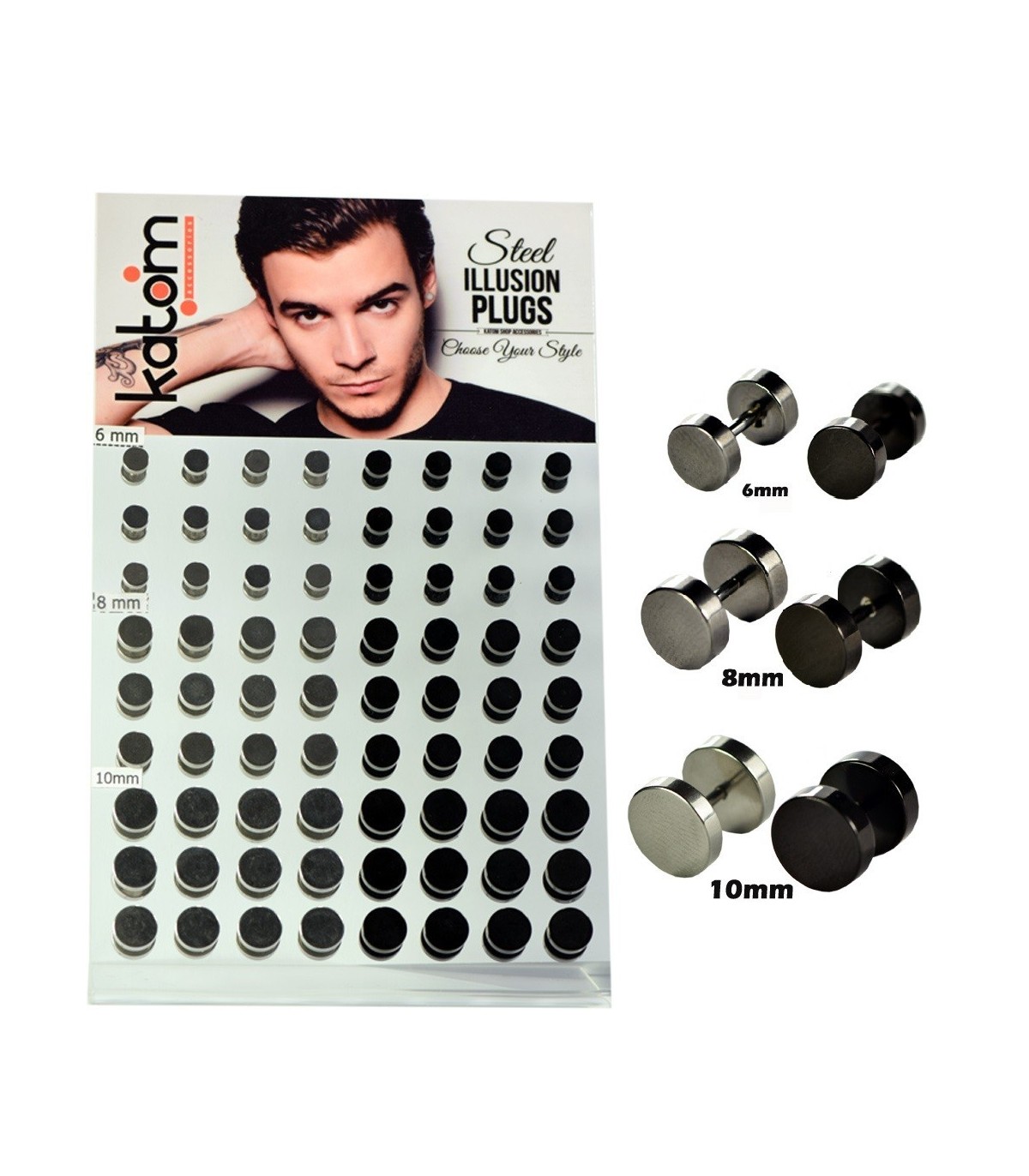 Exhibitor of 48 pieces of illusion plug in black and white. Measures 6mm, 8mm and 10mm for men and women, is super trendy. You can choose loose in packages of 10 pieces per color and measurement.