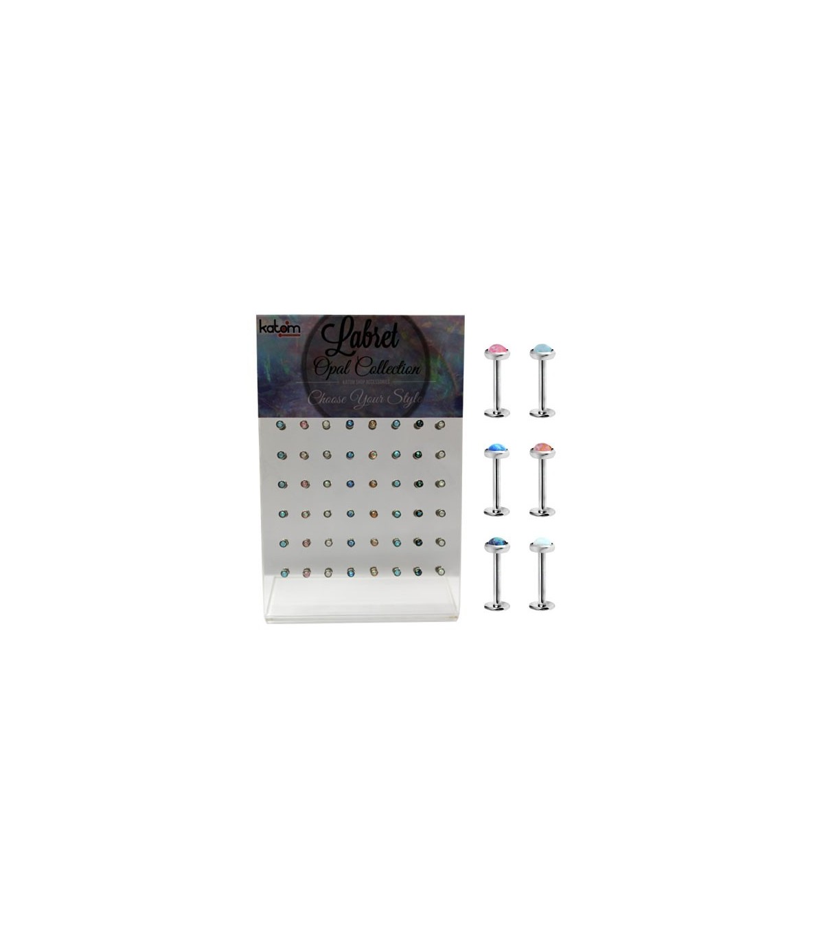 Exhibitor lip piercing surgical steel with glitter ball, in 4 metallic colors.48 units exhibitor.