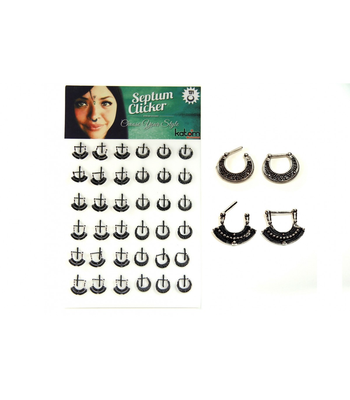 Exhibitor fake septum, sterling silver with tribal designs. Wrought. 4 different models. In 2 different sizes: 8mm, 10mm.42 units per display.