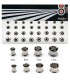 Display with 42 pieces of black pvd, steel and gold flesh tunnel ear plugs sizes 6,8,10,12mm with screw opening system and crystals on top.
