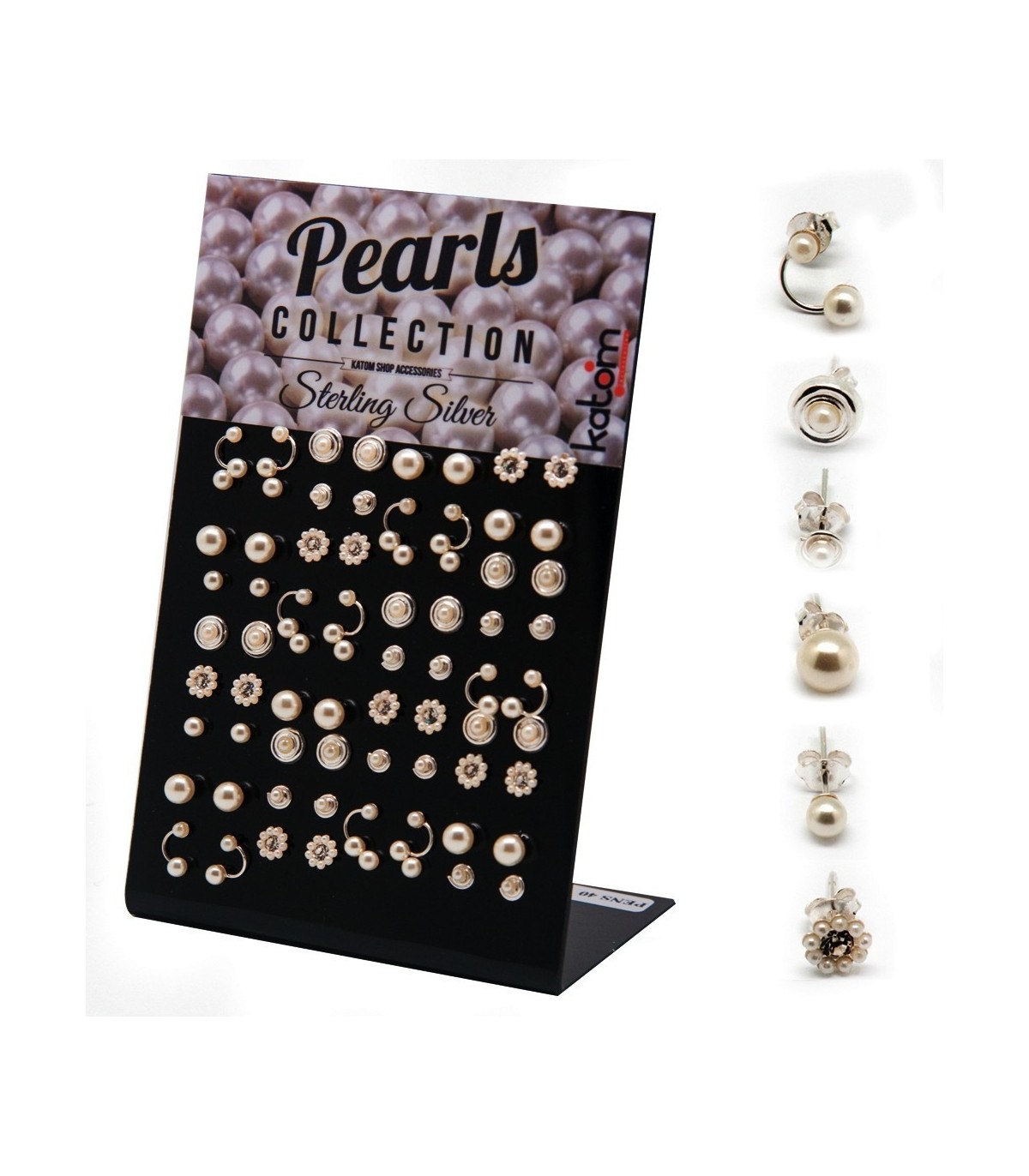 Exhibitor earrings silver Pearl White color. Sizes 4, 5, 6, 8 mm. For woman. (Number of pieces: 72)