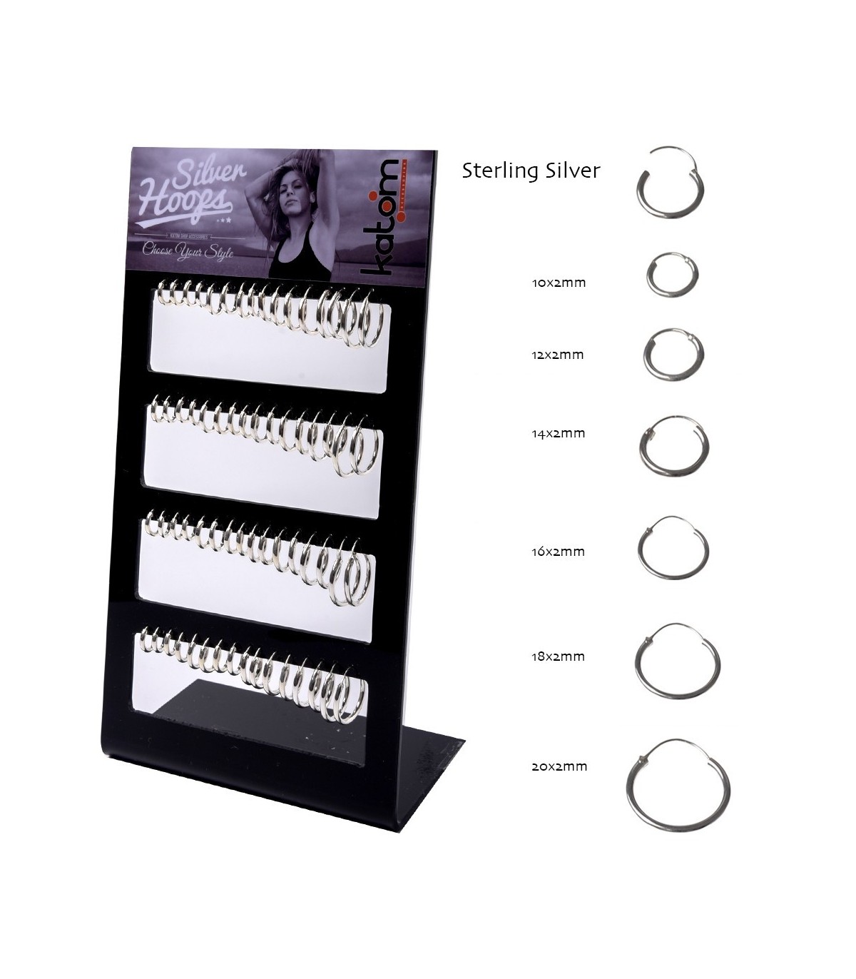 2mm bar silver hoops display, 6 sizes: 10, 12, 14, 16, 18 and 20 mm