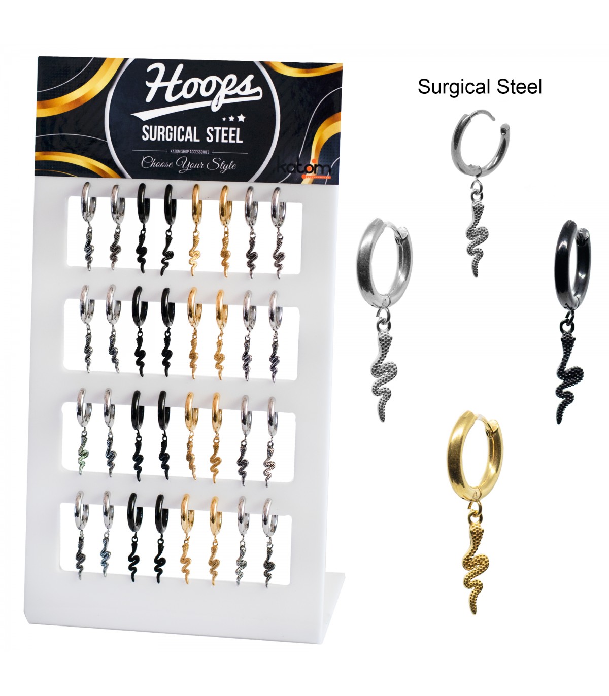 Expositor de aros de acero rectangulares anchos de 4 mm con colgante daga en tres colores, acero, dorado y negro.