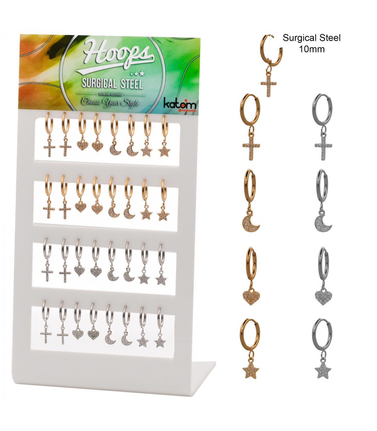 Expositor de aros de acero de 3 x 9 mm lisos y esmaltados con colgante de cruz, en tres colores, acero, negro y dorado.