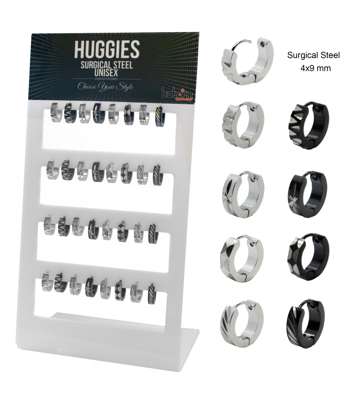 Expositor de aros de acero anchos de 4 mm y diámetro de 9 mm con piedras Swarovski, en tres colores, acero, dorado y negro.