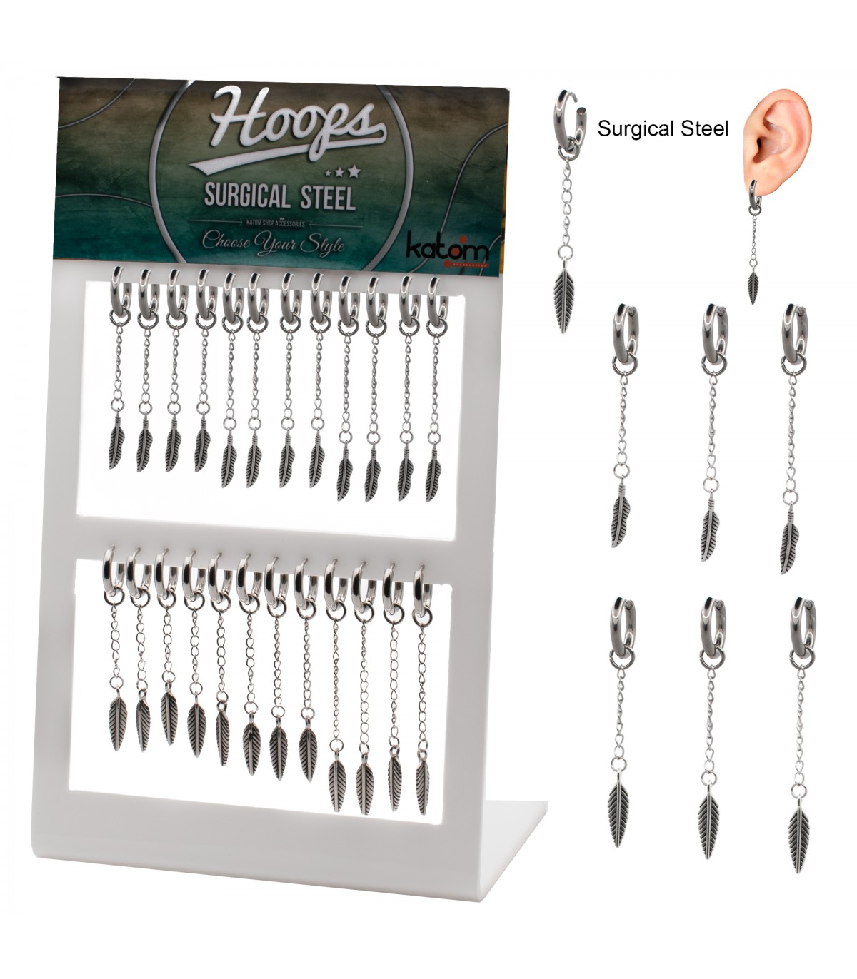 Expositor de falsas dilataciones de acero con colgante de plumas.