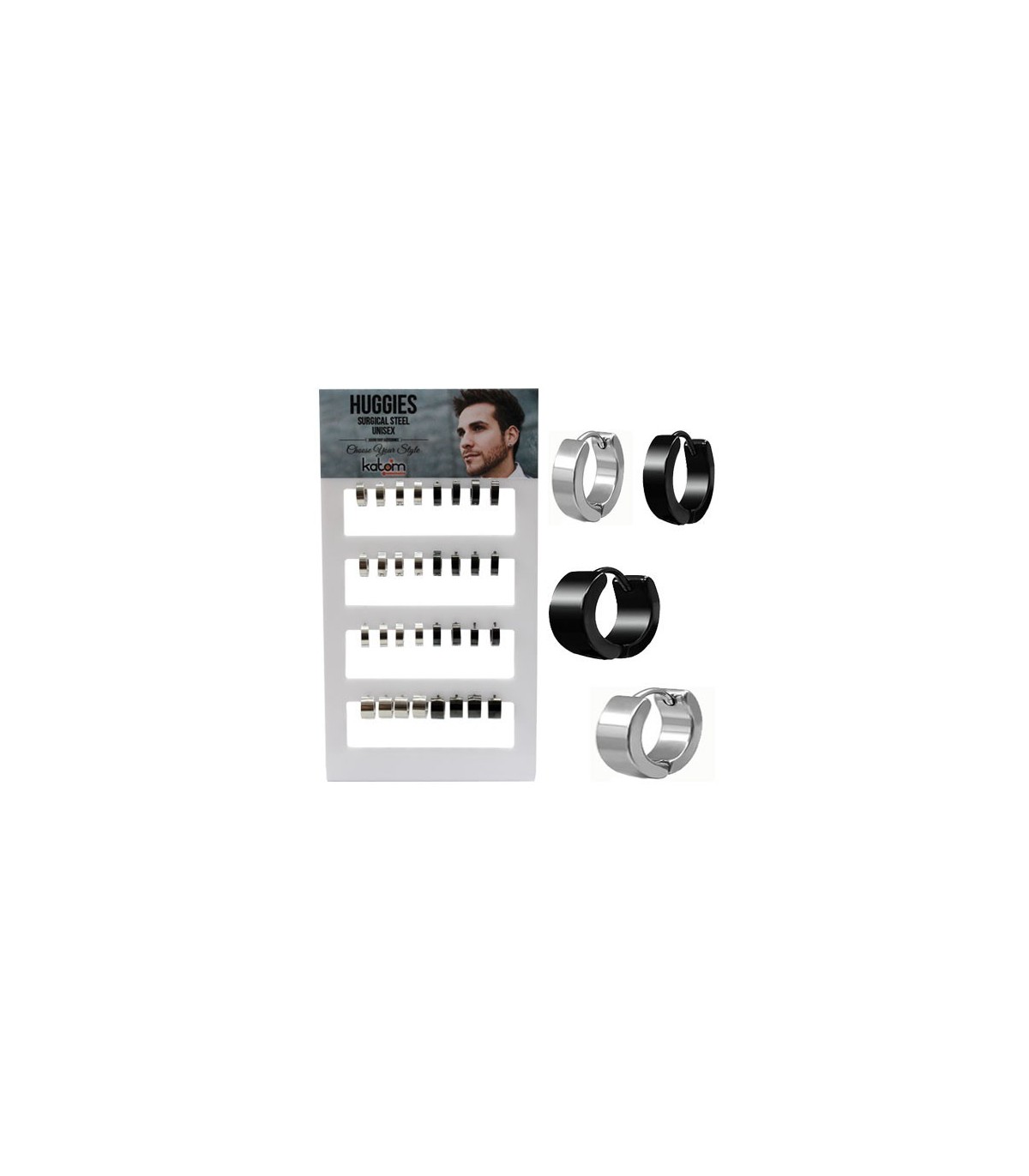Expositor de aros de acero de coloe negro con cierre click, 4 modelos de motivos sobre el aro.