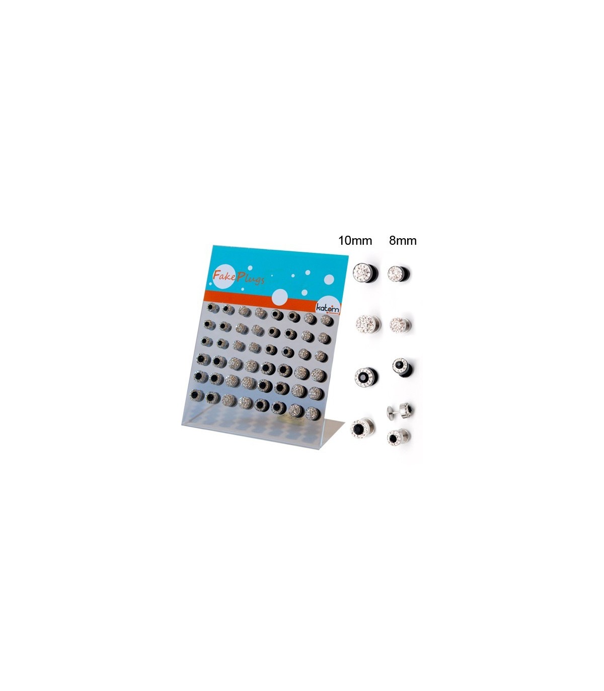 Expositor Falsas Dilataciones de acero quirurgico 2 colores: Negro y Acero. Con cristales tipo swarovski. 6 diseños. Tamaños: 6mm, 8mm, 10mm.