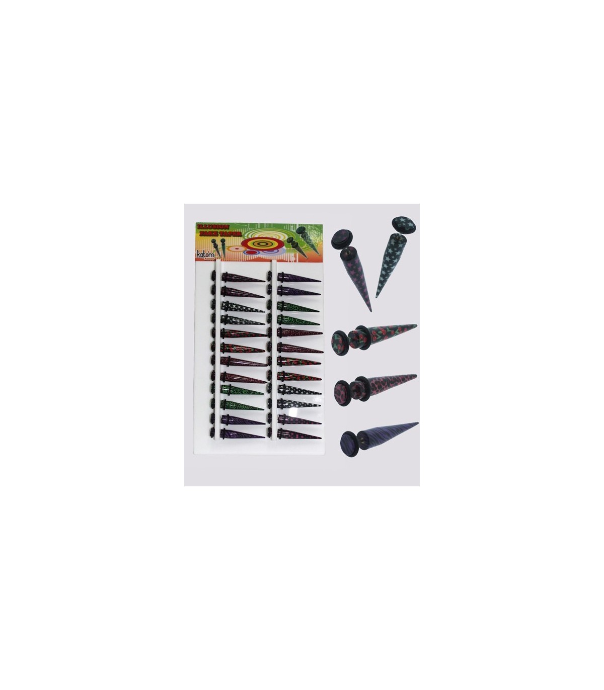 Expositor de falsas dilataciones forma pinchos. Diferentes estampados.