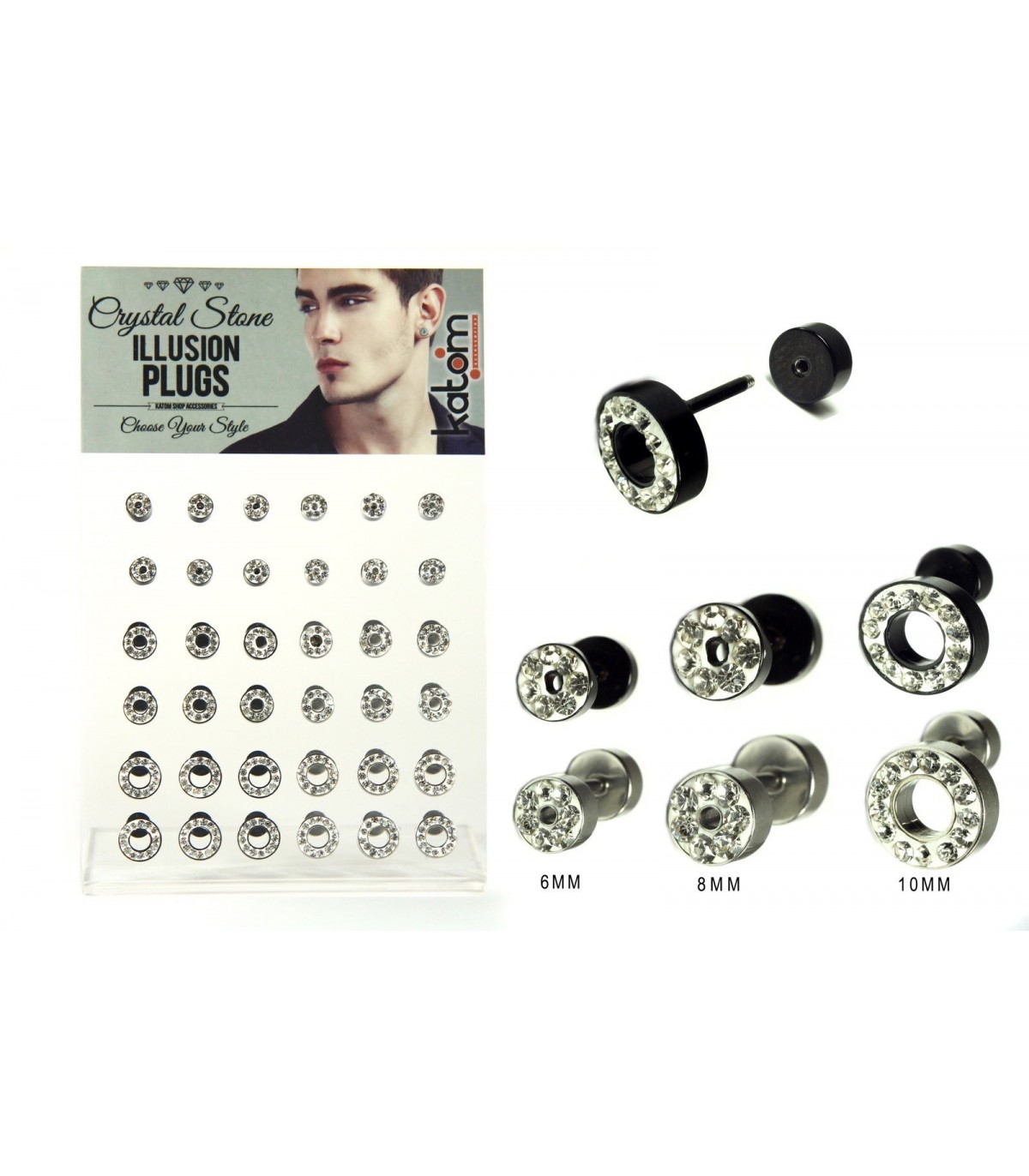 Expositor Falsas Dilataciones de acero quirurgico 2 colores: Negro y Acero. Con cristales tipo swarovski. 6 diseños. Tamaños: 6mm, 8mm, 10mm.