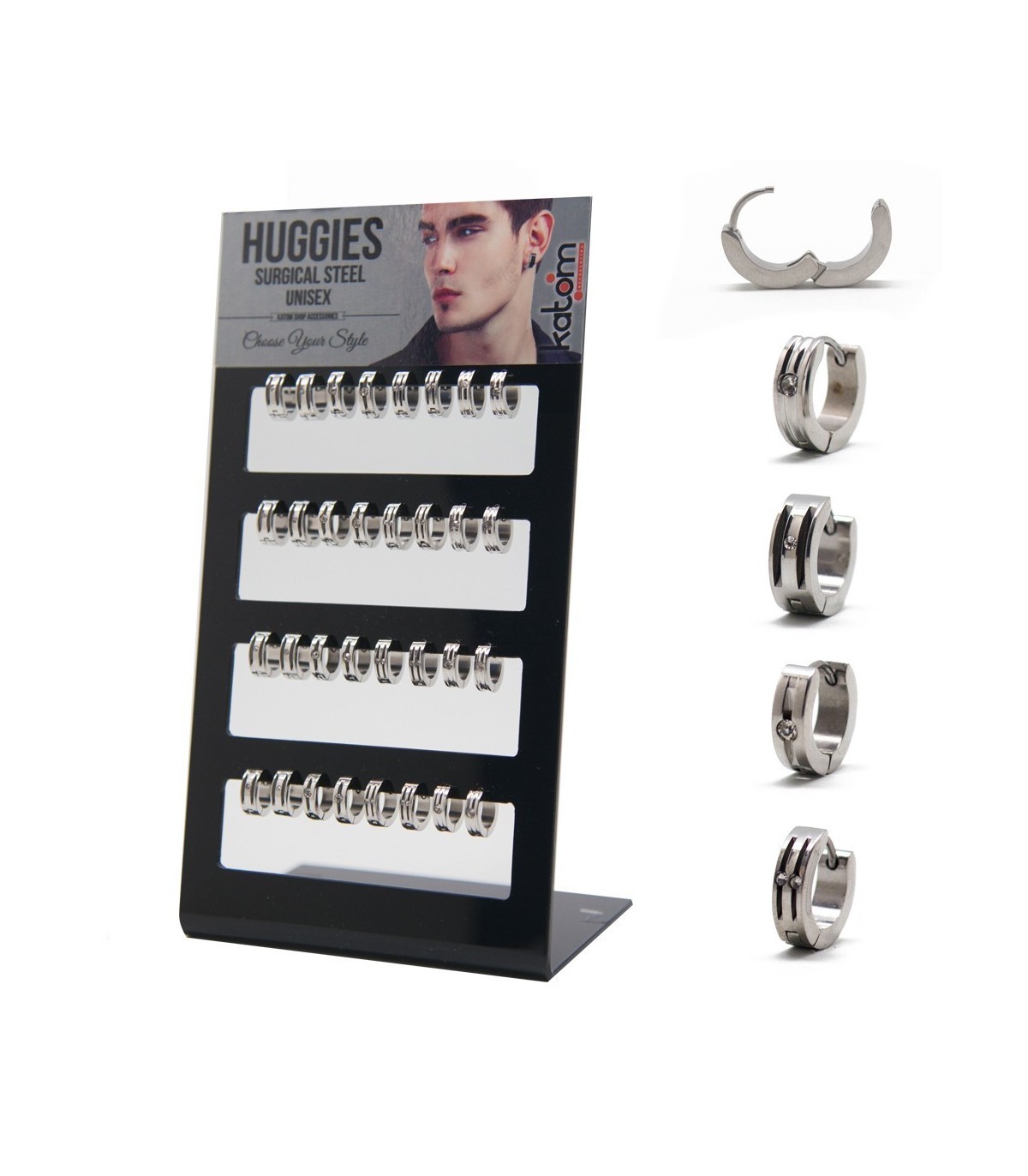 Expositor de aros de acero de coloe negro con cierre click, 4 modelos de motivos sobre el aro.