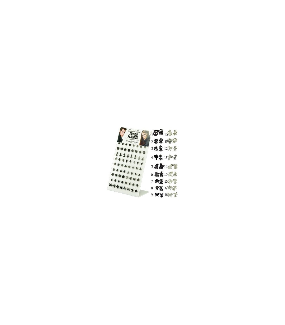 Expositor de doble pendiente de acero. Bola en un lado y varios motivos en el otro para poner en agujeros de pendiente y helix; en dos colores: acero y dorado.