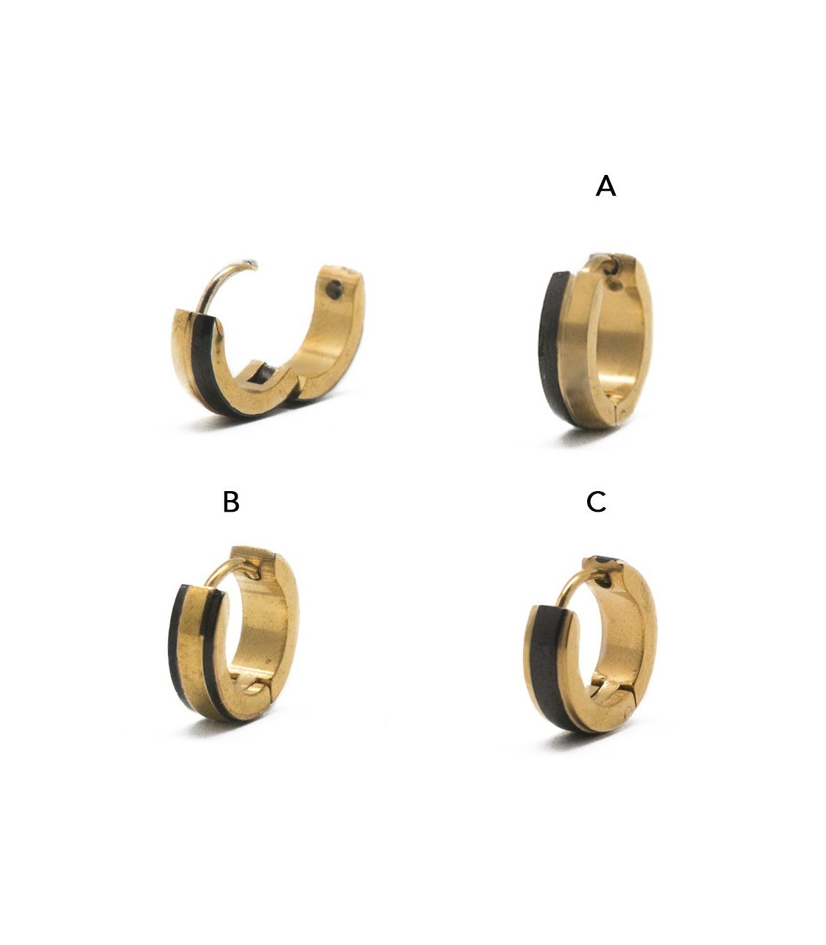 Expositor de aros de acero anchos de 4 mm y diámetro de 9 mm con piedras Swarovski, en tres colores, acero, dorado y negro.