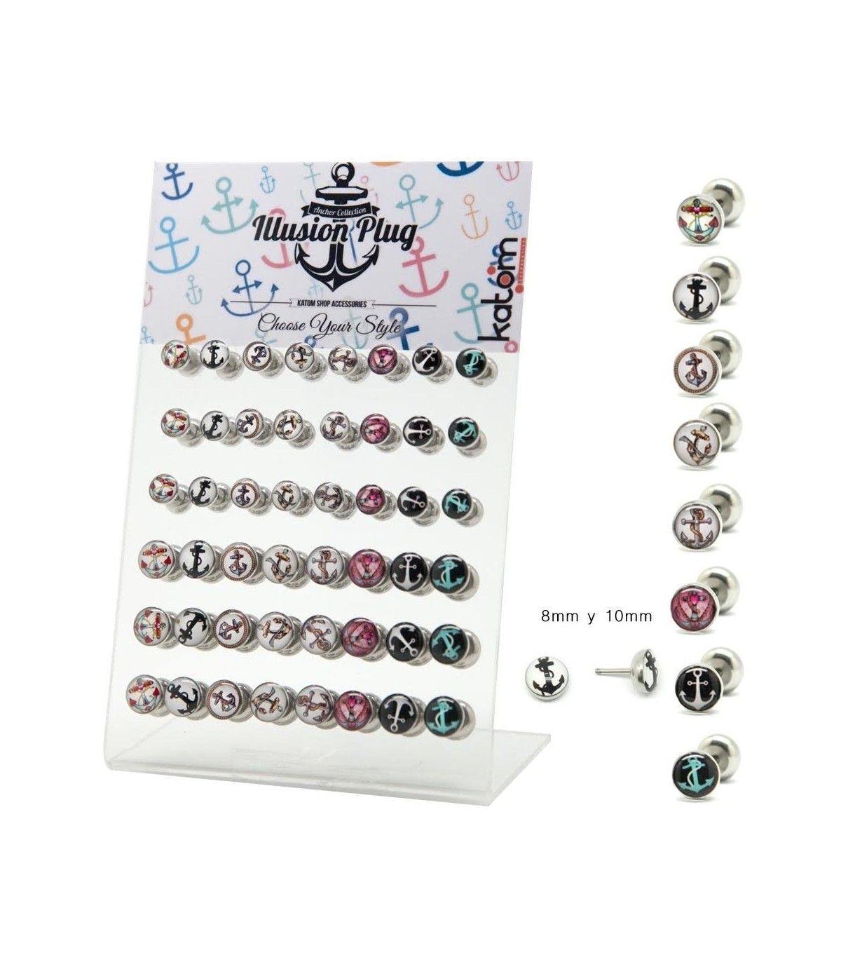 Expositor de falsas dilataciones. Con simbolos. Diseños de la moda actual. 8mm, unisex.