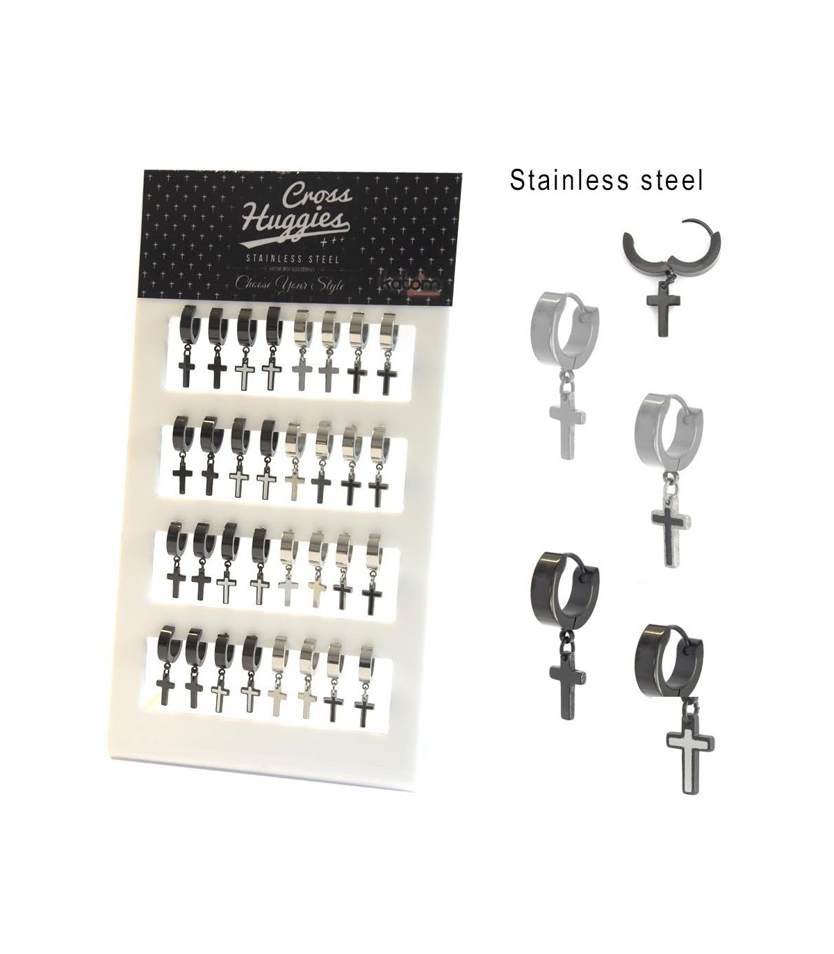 Expositor de aros de acero de 3 x 9 mm lisos y esmaltados con colgante de cruz, en dos colores, acero y negro.