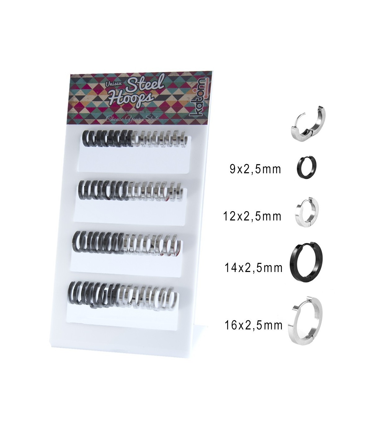Expositor de aros de acero con perfil cuadrado de 2,5 mm de ancho, en color negro o acero y 4 tamaños de diámetro: 9, 12, 14 y 16 mm.