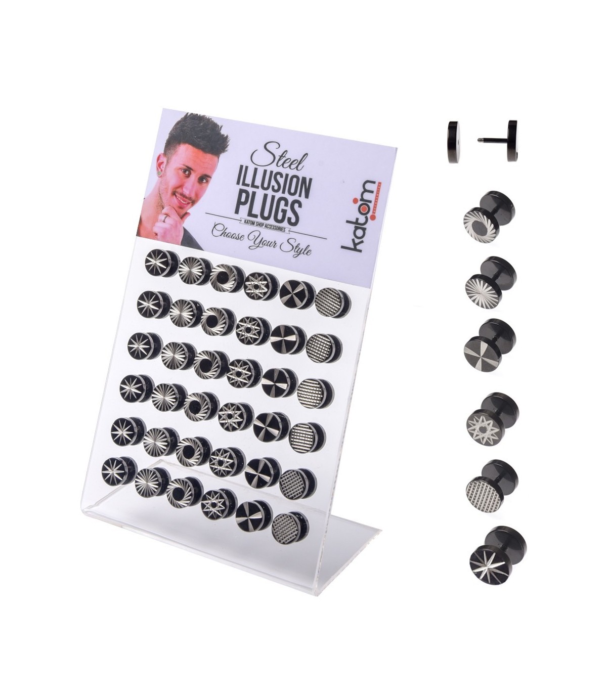 Expositor de falsas dilataciones de acero en color negro y acero, de 10 mm de diámetro, grabadas al láser, 6 modelos diferentes.