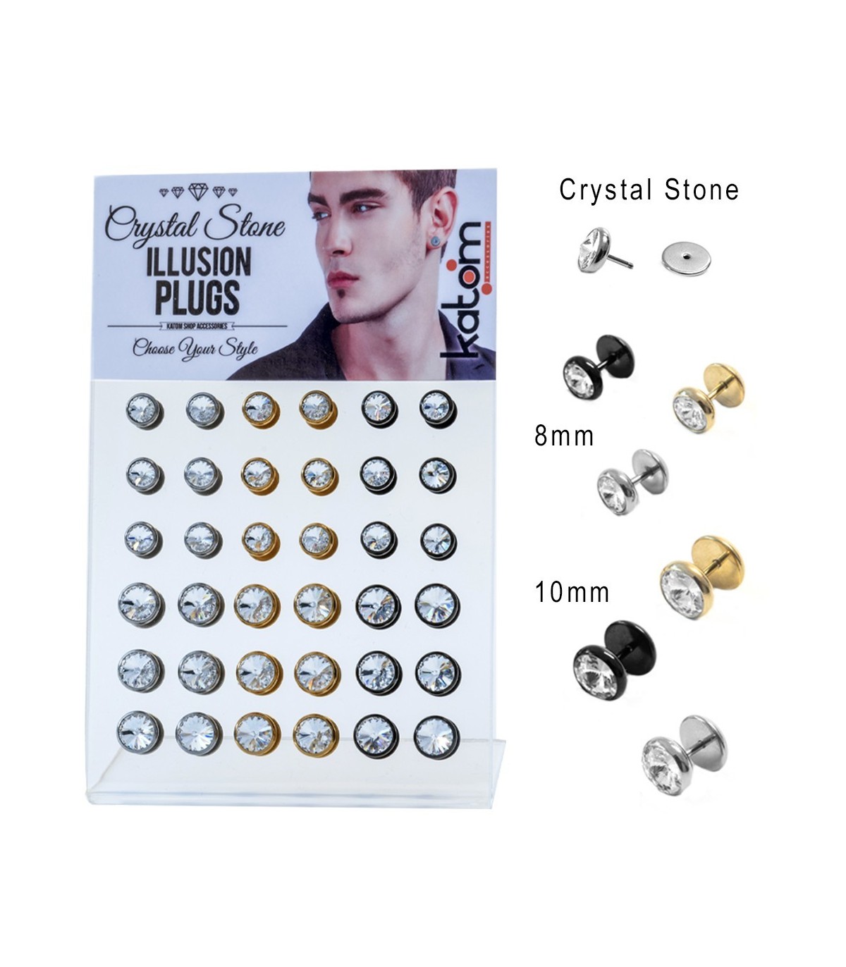Expositor Falsas Dilataciones de acero quirurgico 2 colores: Negro y Acero. Con cristales tipo swarovski. 6 diseños. Tamaños: 6mm, 8mm, 10mm.