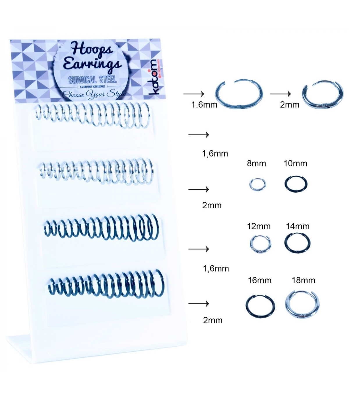 Expositor de aros brillantes de acero- Cuatro tamaños: 6mm, 8mm, 10mm y 12mm- Dos colores: acero y dorado(Número de piezas: 64)