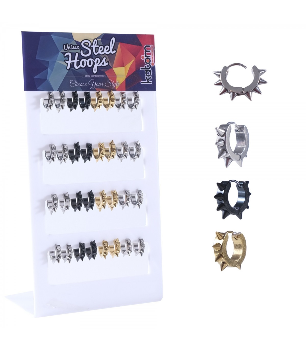 Expositor de aros de acero con colgante forma serpienteTres colores: acero, dorado y negro(Numero de piezas: 32)