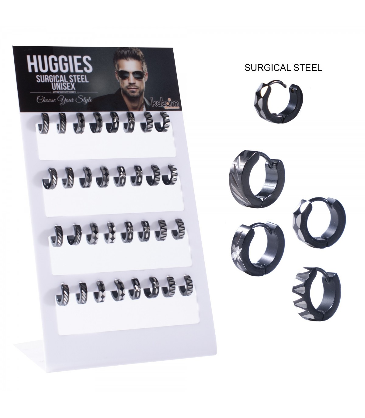 Expositor de aros de acero anchos de 4 mm y diámetro de 9 mm con piedras Swarovski, en tres colores, acero, dorado y negro.