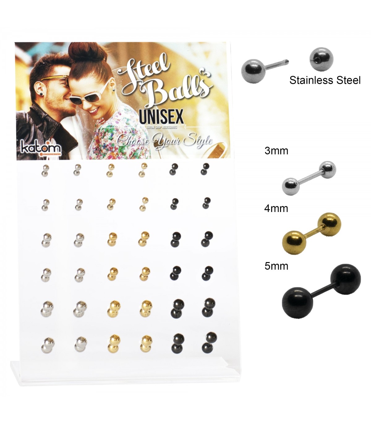 Expositor de 32 piezas de falsas dilataciones de acero con un punto brillante a un lado y liso al otro lado. Medidas 4mm, 5mm, 6mm, 8mm.para hombre y mujer.