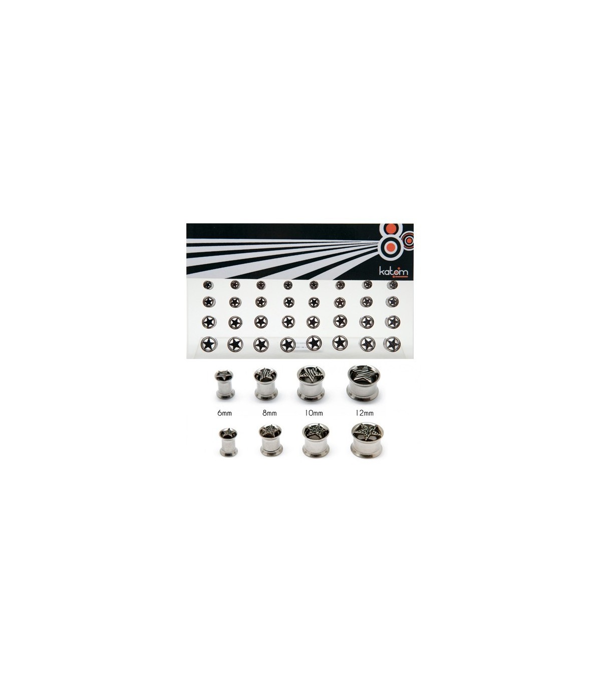 Expositor de dilataciones en 3 colores acero, acero negro y dorado, con cristales encima; medidas 6, 8, 10, 12mm para chico y chica.