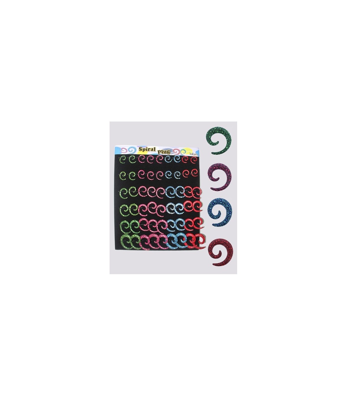 Expositor de dilatadores forma espiral de tallas 3mm, 4mm ,5mm, 6mm ,8mm y 10mm. en colores verde, amarillo, fucsia, lila y celeste.