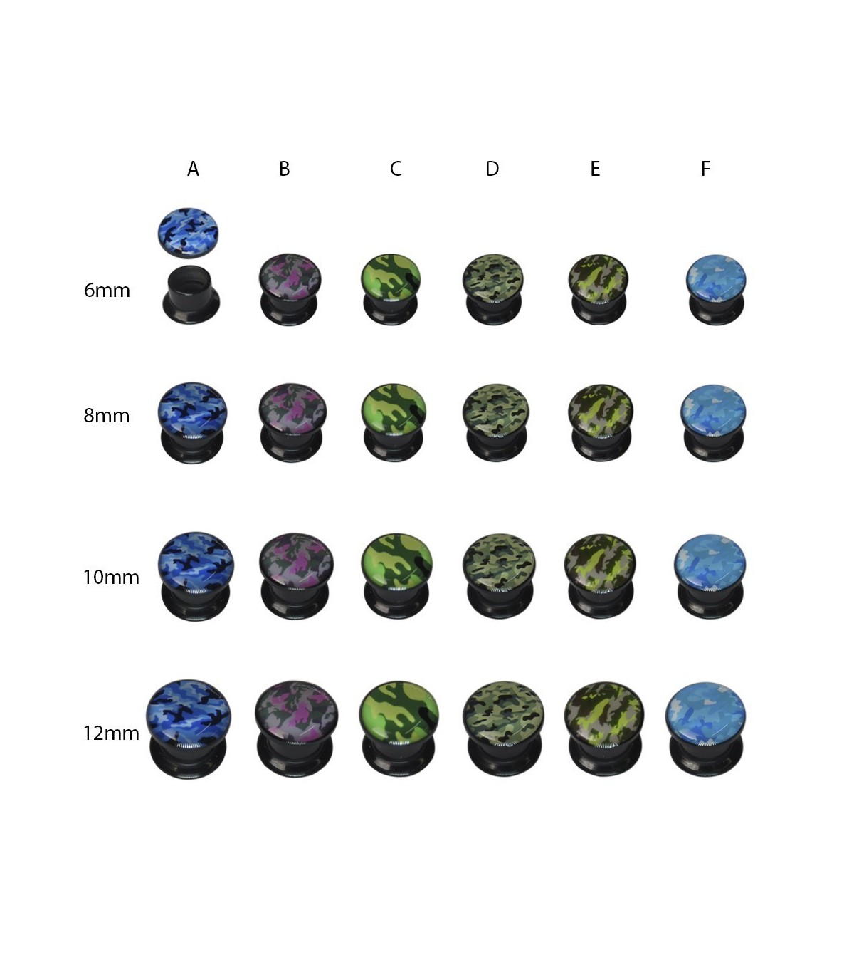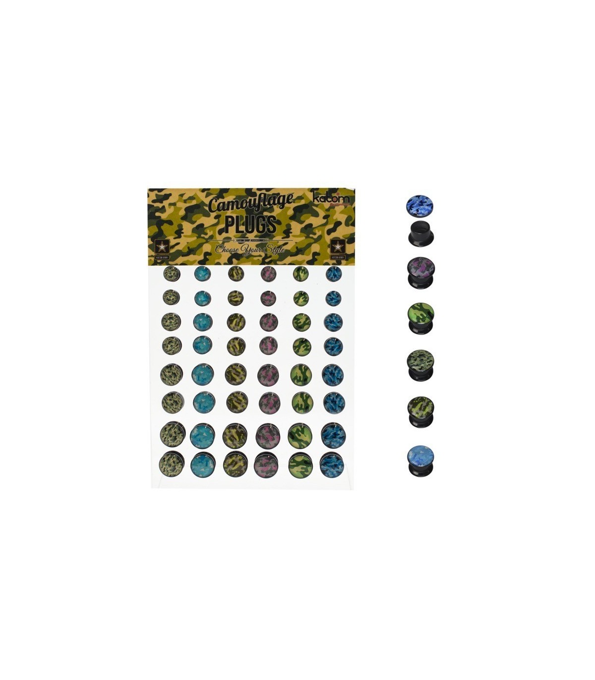 Expositor dilataciones a Rosca. Tapadas. Con diseño de camuflaje. En material Acrilico. En 6 colores diferentes. Tamaños. 6mm, 8mm, 10mm, 12mm.
