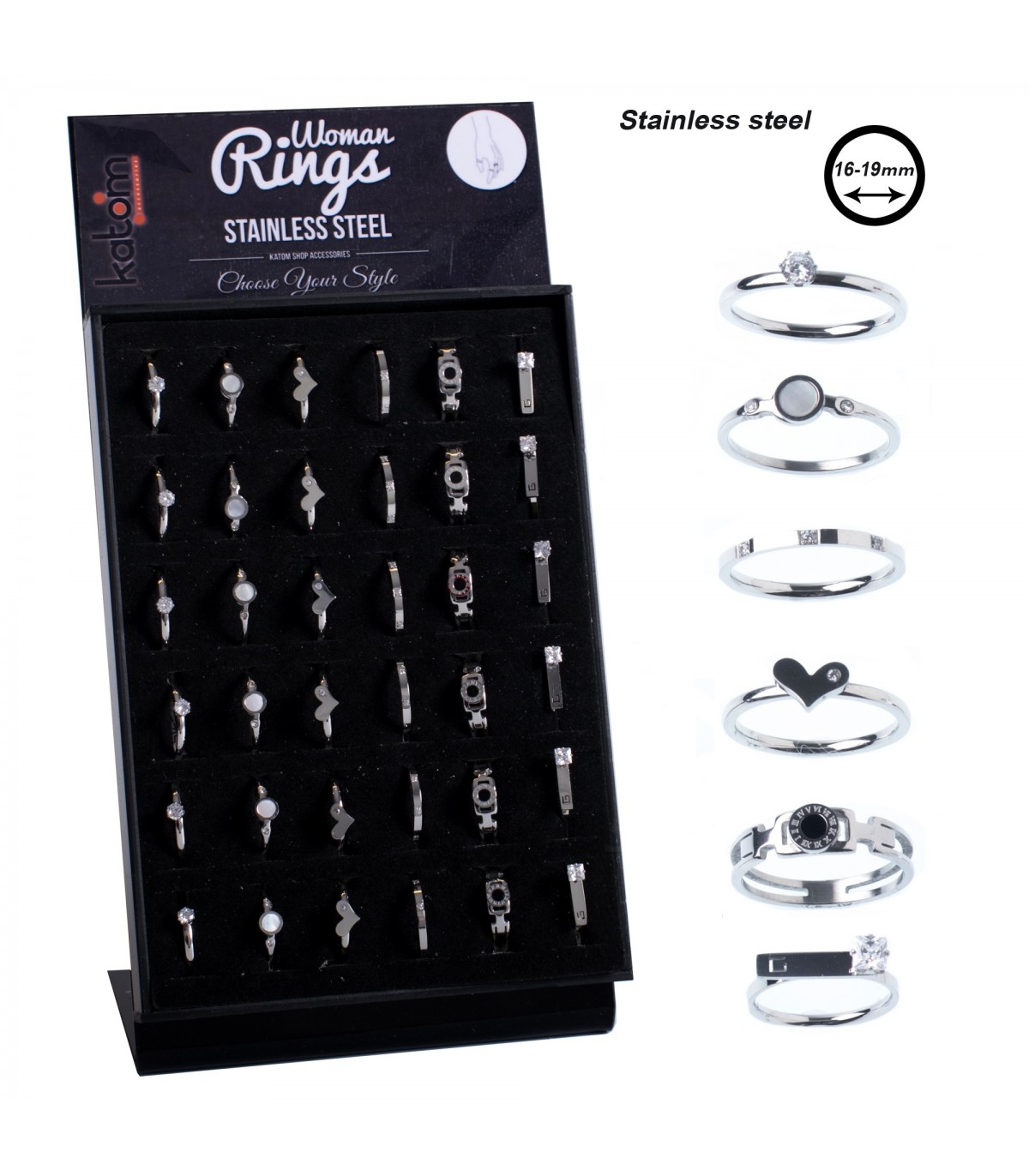 Expositor de anillos de acero para chica, tallas 16 a 19 mm, 6 modelos diferentes.