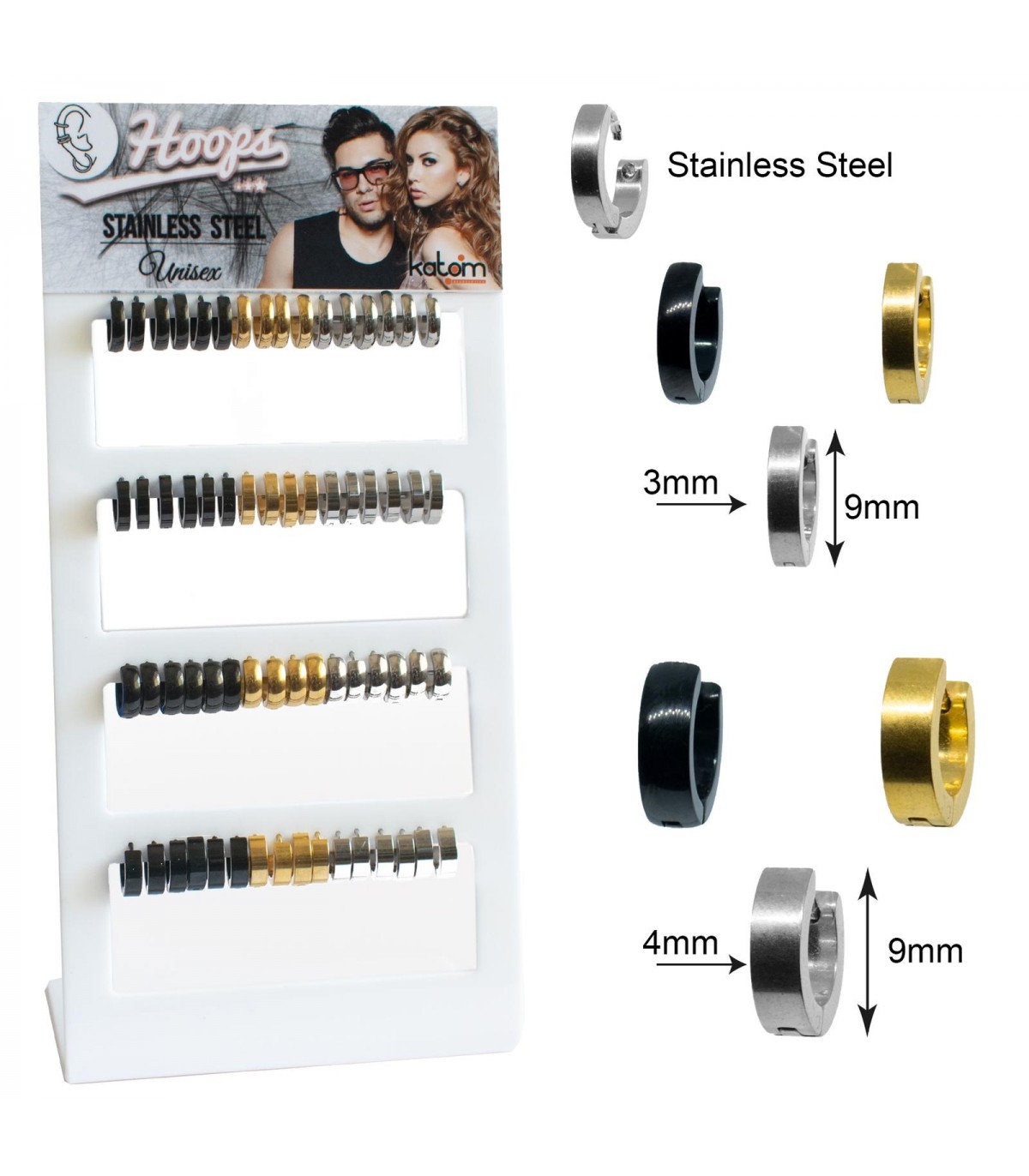 Expositor de aros de acero anchos de 4 mm y diámetro de 9 mm con piedras Swarovski, en tres colores, acero, dorado y negro.