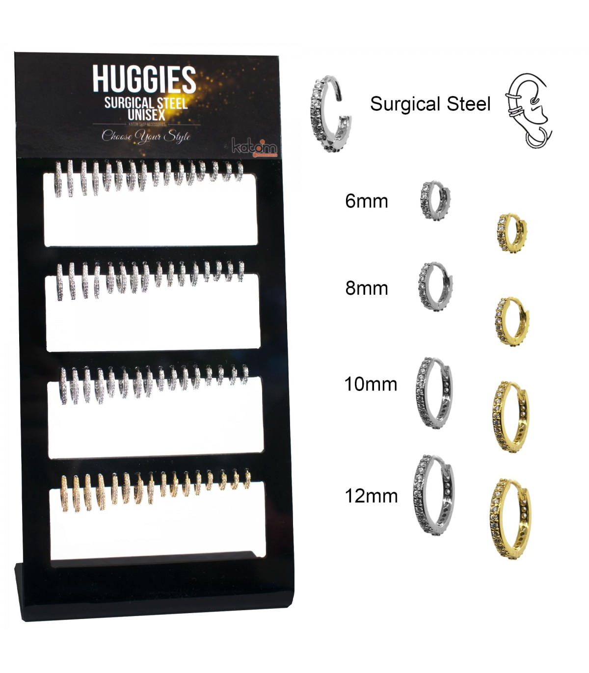 Expositor de aros de acero anchos de 4 mm y diámetro de 9 mm con piedras Swarovski, en tres colores, acero, dorado y negro.