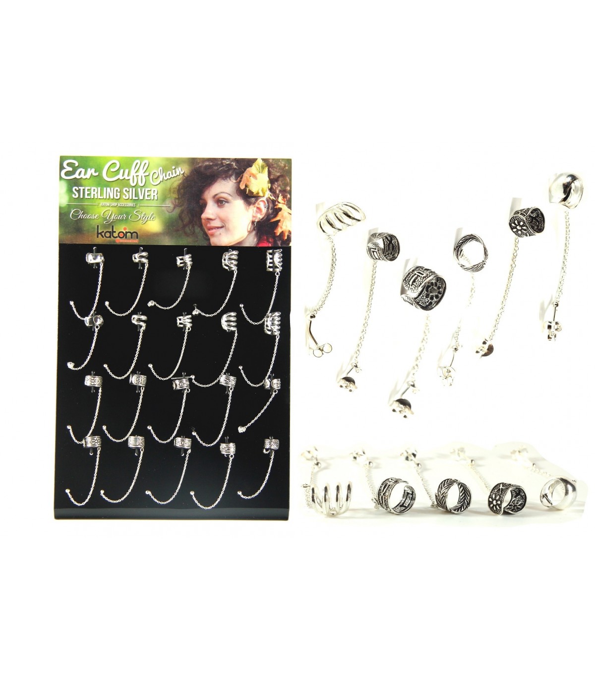 Expositor de aros de oreja Ear Cuff para cartílago flexibles de plata con diseños étnicos. Muy popular. 18 modelos diferentes.