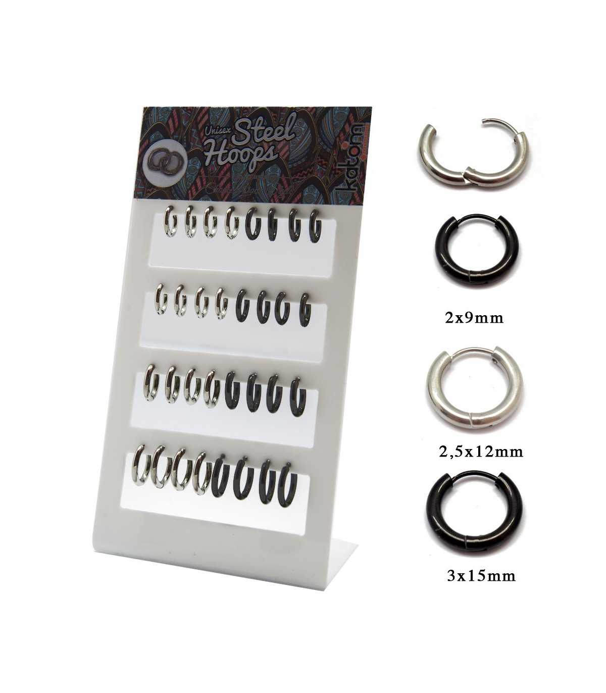 Expositor de aros de acero en colores negro y acero grabados, 4 modelos. ¡Perfecto para chicos!