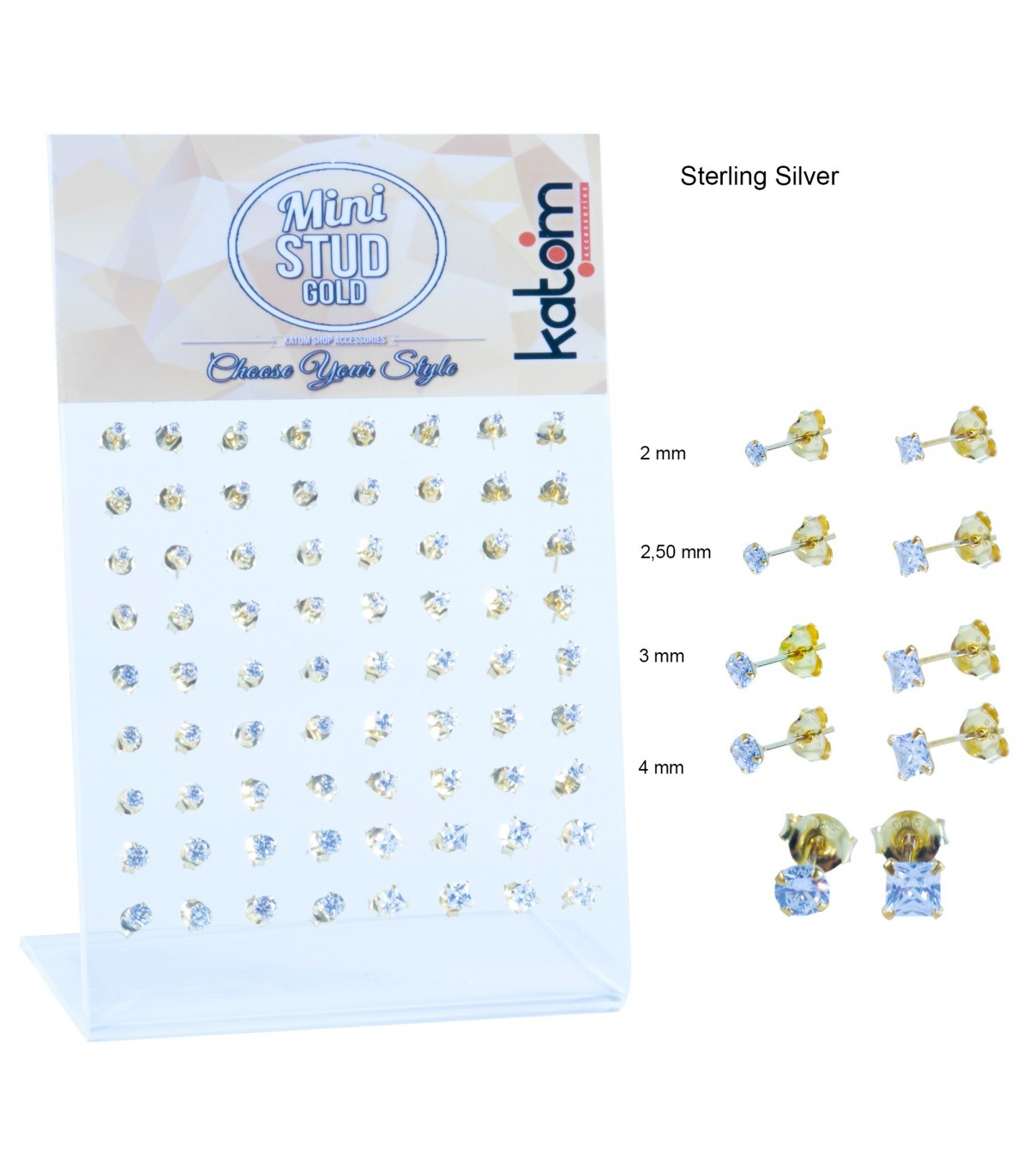 Expositor de pendientes de plata redondos y cuadrados chapados en oro con circonita en tamaño mini, de 2, 2.5, 3 y 4 mm.