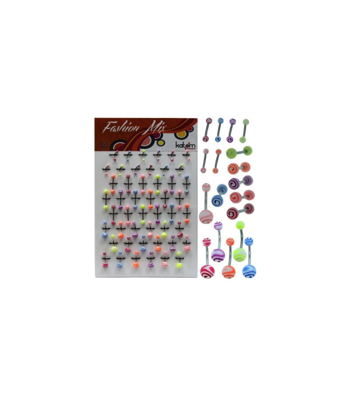 Expositor de 60 piercing de ceja de 6 y 8 mm con 2 bolas .muy popular para la ceja y oreja. Para chico y chica.