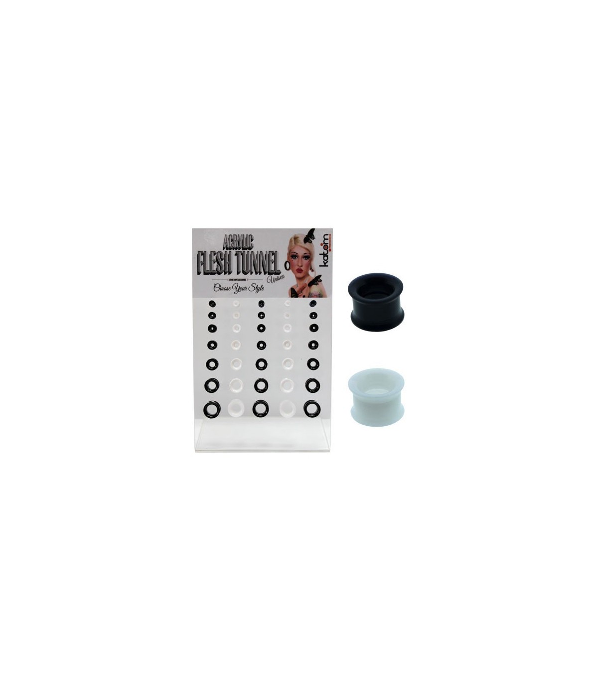 Expositor de dilataciones. Flesh Tunnel. Material: Acrilico. En colores Blanco y Negro.