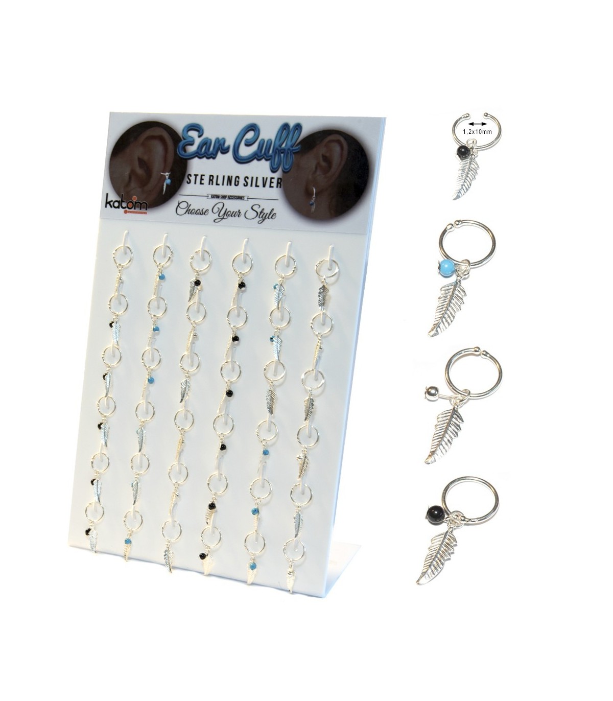 Expositor de aros de oreja Ear Cuff para cartílago flexibles de plata con diseños étnicos. Muy popular. 18 modelos diferentes.