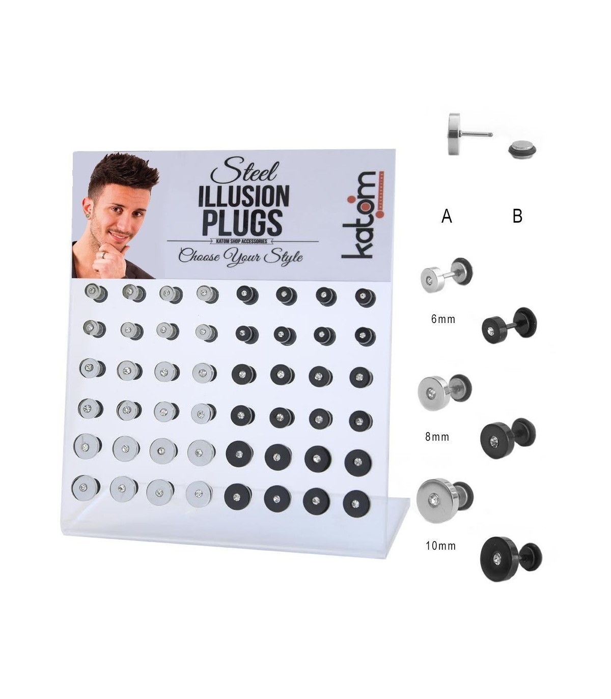 Espositor de 48 piezas con las medidas más populares 6, 8 y 10 mm en color acero y color negro