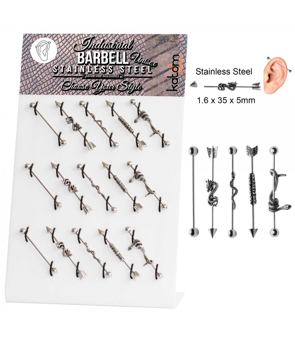 Piercing barbell industrial de acero quirúrgico compuesto por una barra de 1,6 mm con espiral en medio de 5mm y dos bolitas a los extremos, en cuatro colores (plateado, negro, dorado y arco iris) y en dos largos (35mm...