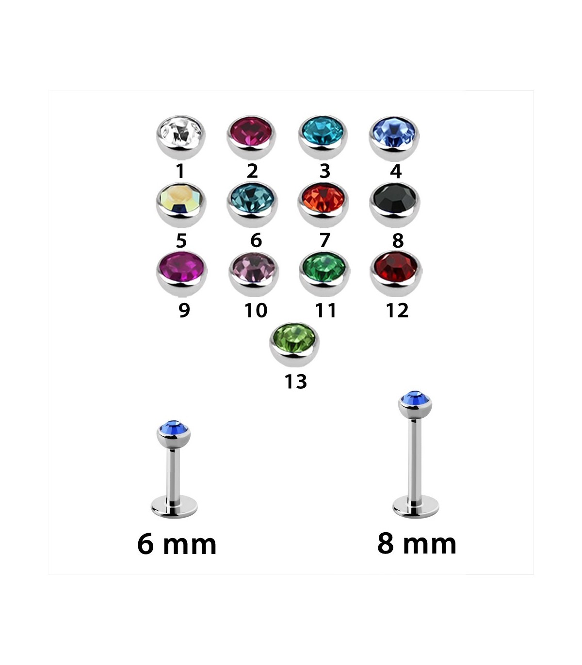 Piedra de 13 diferentes colores de medidas 3mm; la piedra está incrustada en una bola plana de 3mm que hace que se vea más el cristal y que quede más integrado.