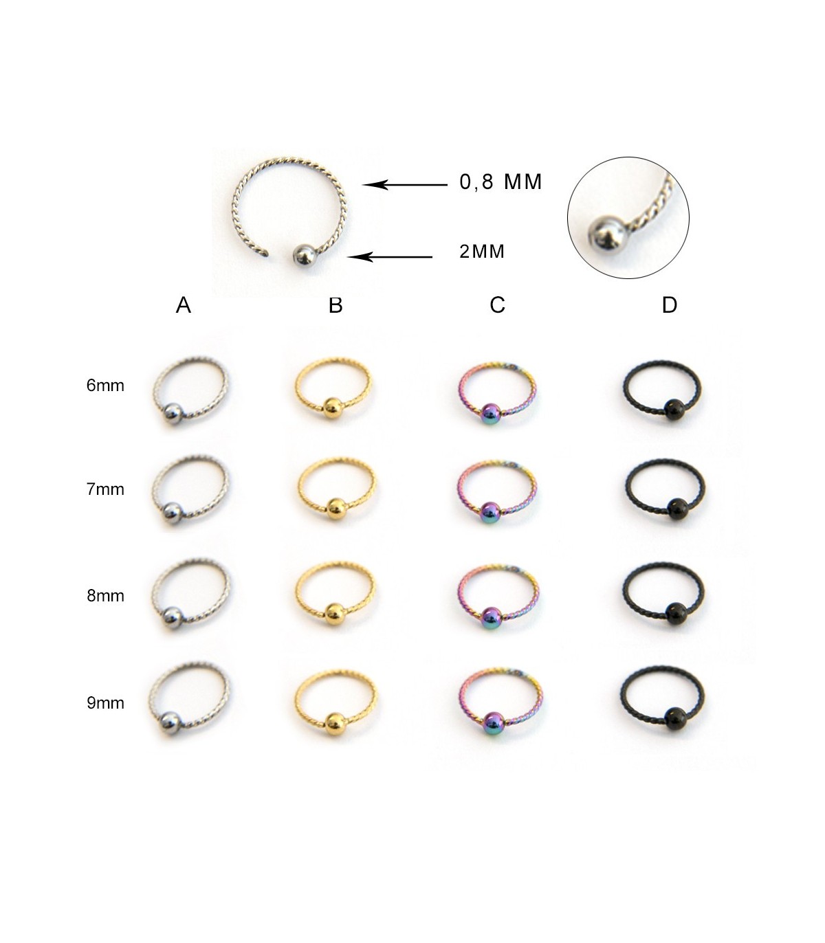 Expositor de aros de acero, con barra de 1,2 mm y diámetro de 8 mm, en tres colores (acero, negro y dorado) que puede usarse para el daith,Tragus, Helix, para la ceja, para el labio, para la nariz y como pendiente...